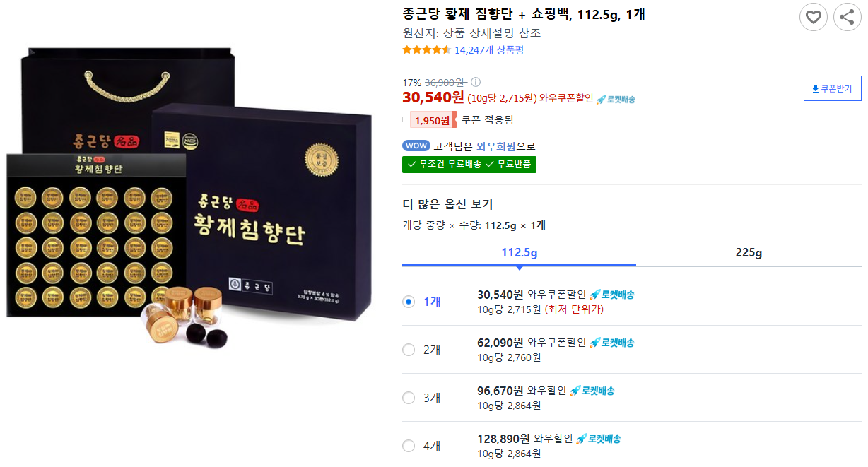 종근당 황제 침향단 + 쇼핑백, 112.5g, 1개 - 건강환 | 쿠팡