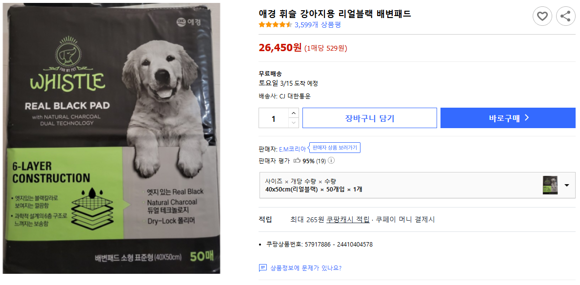 현재 별점 4.6점, 리뷰 3599개를 가진 휘슬 리얼블랙 배변패드! 지금 쿠팡에서 더 저렴하고 다양한 배변패드 제품들을 확인해보세요.