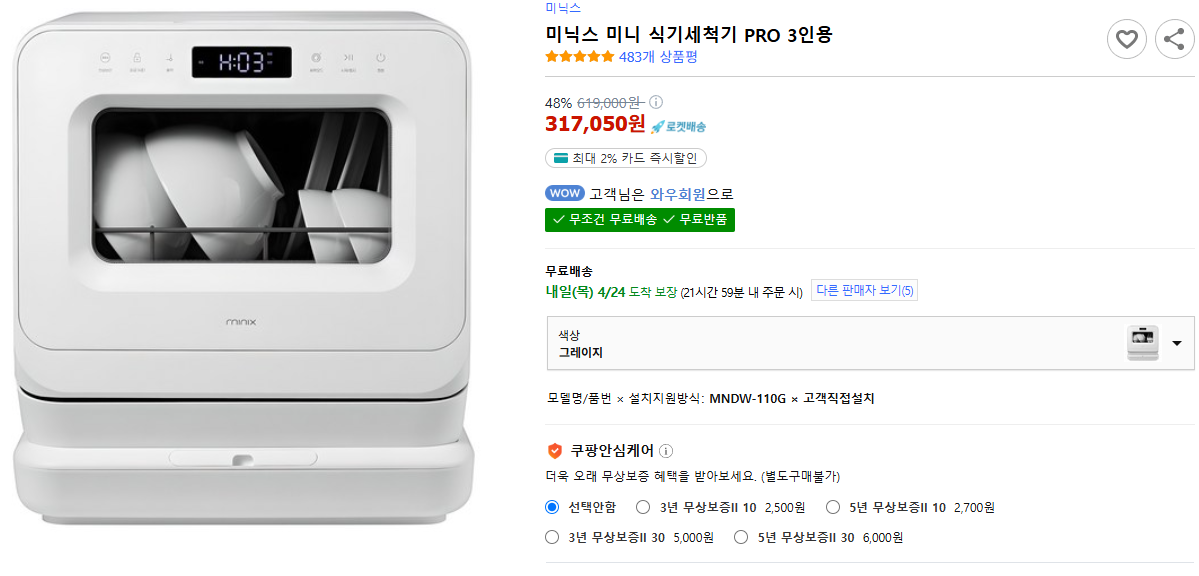 현재 별점 4.7점, 리뷰 483개를 가진 미닉스 미니 식기세척기 PRO 3인용! 지금 쿠팡에서 더 저렴하고 다양한 식기세척기 제품들을 확인해보세요.