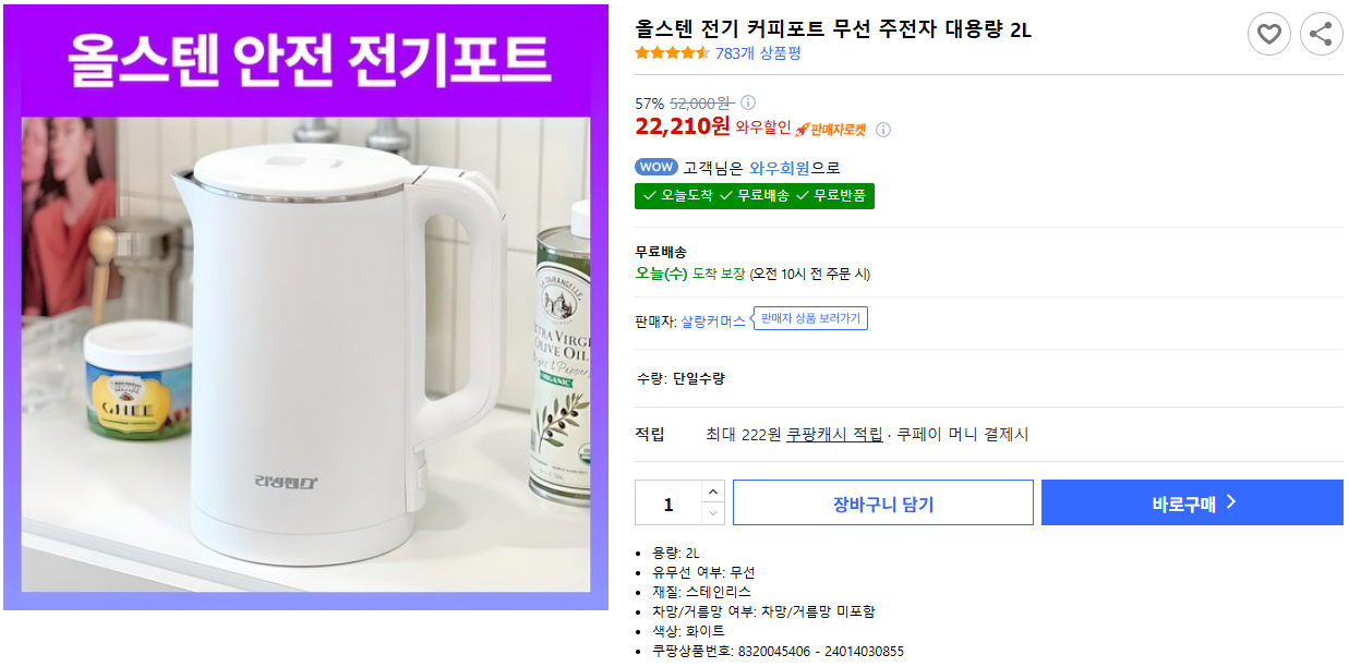 현재 별점 4.6점, 리뷰 783개를 가진 올스텐 전기 커피포트 무선 주전자 대용량 2L! 지금 쿠팡에서 더 저렴하고 다양한 전기포트 제품들을 확인해보세요.