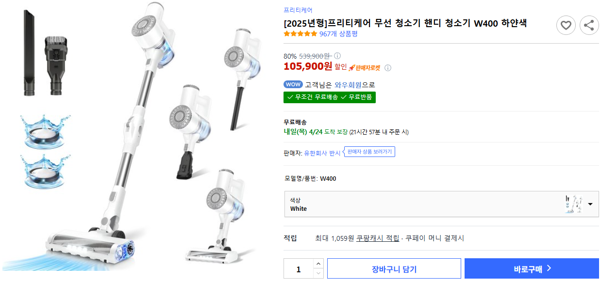 현재 별점 4.8점, 리뷰 967개를 가진 [2025년형]프리티케어 무선 청소기 핸디 청소기 W400 하얀색! 지금 쿠팡에서 더 저렴하고 다양한 스틱청소기 제품들을 확인해보세요.