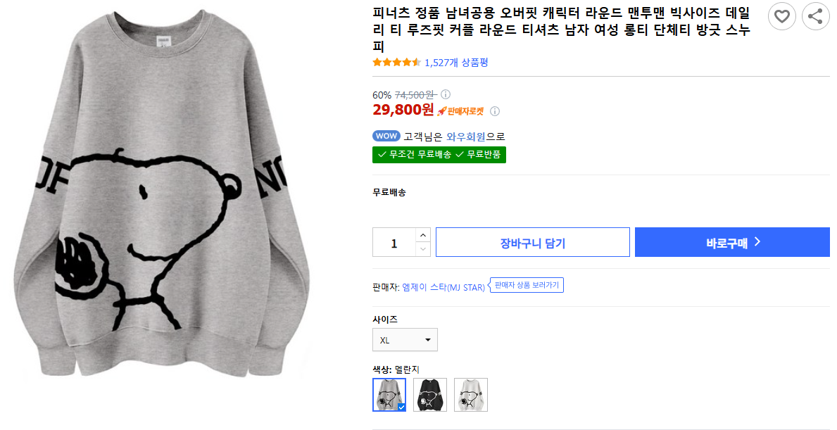 현재 별점 4.5점, 리뷰 1527개를 가진 피너츠 정품 남녀공용 오버핏 캐릭터 라운드 맨투맨 빅사이즈 데일리 티 루즈핏 커플 라운드 티셔츠 남자 여성 롱티 단체티 방긋 스누피! 지금 쿠팡에서 더