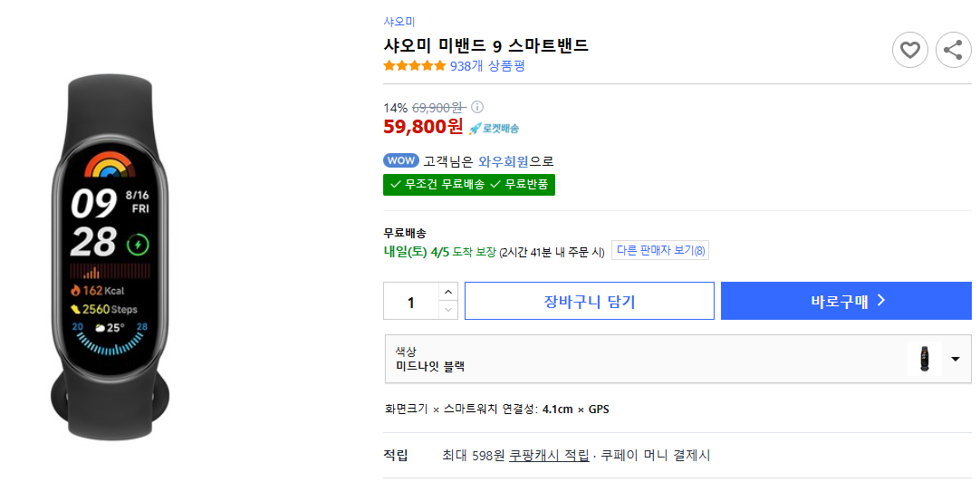 현재 별점 4.8점, 리뷰 938개를 가진 샤오미 미밴드 9 스마트밴드! 지금 쿠팡에서 더 저렴하고 다양한 스마트워치/밴드 제품들을 확인해보세요.