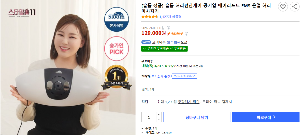 현재 별점 4.5점, 리뷰 1427개를 가진 [슬룸 정품] 슬룸 허리편한케어 공기압 에어리프트 EMS 온열 허리 마사지기! 지금 쿠팡에서 더 저렴하고 다양한 안마기 제품들을 확인해보세요.