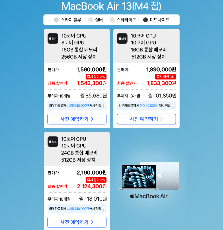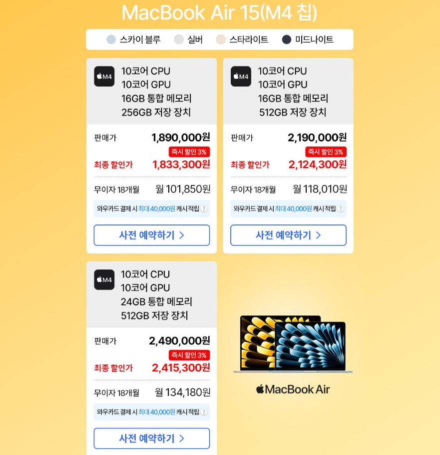 2025 맥북에어 13/15 사전예약 시작! 신형 M4 칩, 지금 알아보세요